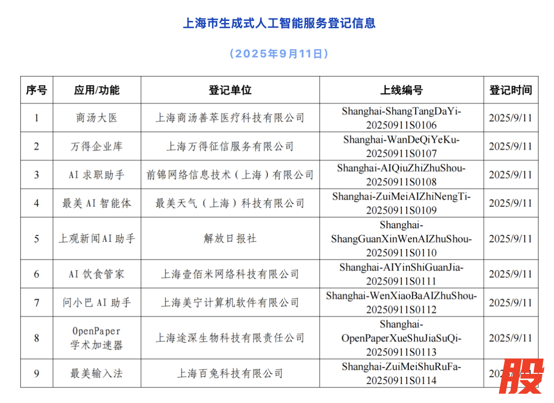 上海新增9款已完成登记的生成式人工智能服务上海新增9款已完成登记的生成式人工智能服务